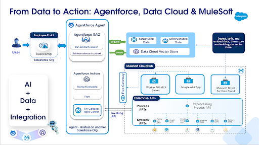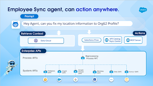 These changes need to be reflected across all systems where that data resides. This is where MuleSoft plays a critical role in integrating all these systems. Today, we use MuleSoft to seamlessly integrate and deliver employee data to over 90+ internal and external systems. We’ve also harnessed the power of AI and Agentforce along with our existing MuleSoft integrations to better understand user needs, enhance the overall experience, and proactively resolve discrepancies in employee data with minimal human involvement.