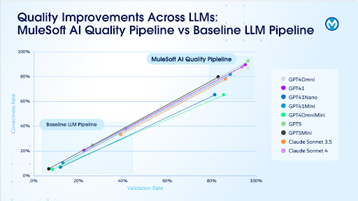 Using the same model, our pipeline reliably delivers high-quality flows that are both valid and correct. In contrast, the baseline LLM pipeline often generates outputs that look plausible on the surface but break down due to syntax errors, incompatible operations, or missing business logic. The chart below highlights the quality gains achieved when moving from the baseline LLM pipeline to our MuleSoft AI quality pipeline.