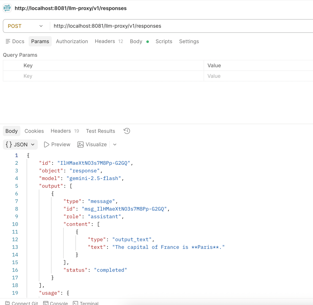curl -s -X POST http://localhost:8081/llm-proxy/v1/responses -H "Content-Type: application/json" -H "client_id: <YOUR_CLIENT_ID>" -H "client_secret: <YOUR_CLIENT_SECRET>" -H "ClientId: <YOUR_CLIENT_ID>" -d '{"model":"gemini/gemini-2.5-flash","input":"What is the capital of France?"}'