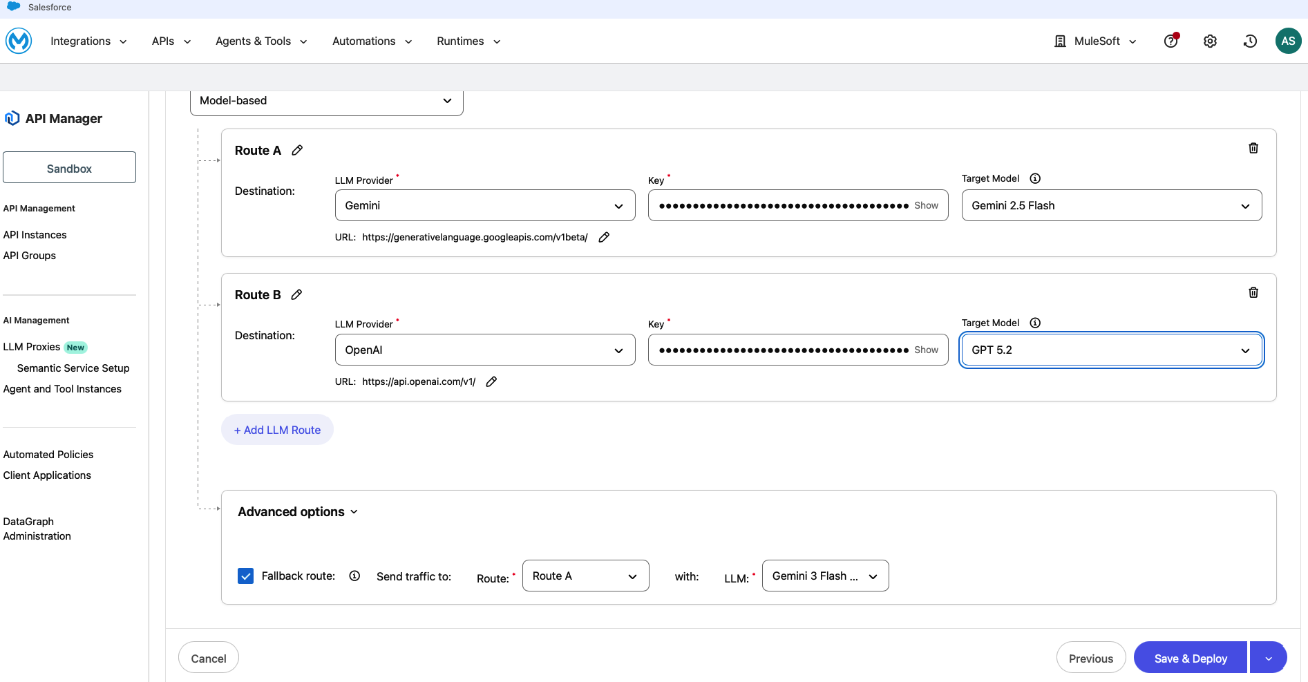 This ensures that if a primary route fails, traffic automatically falls back to a different model. Then, click Save & Deploy.