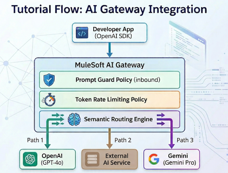 As enterprises scale their AI initiatives, the need for a centralized, governed layer between applications and large language models (LLMs) has become critical. MuleSoft’s AI Gateway, built on the battle-tested Flex Gateway, provides a unified entry point to manage, secure, and monitor LLM traffic across your organization.