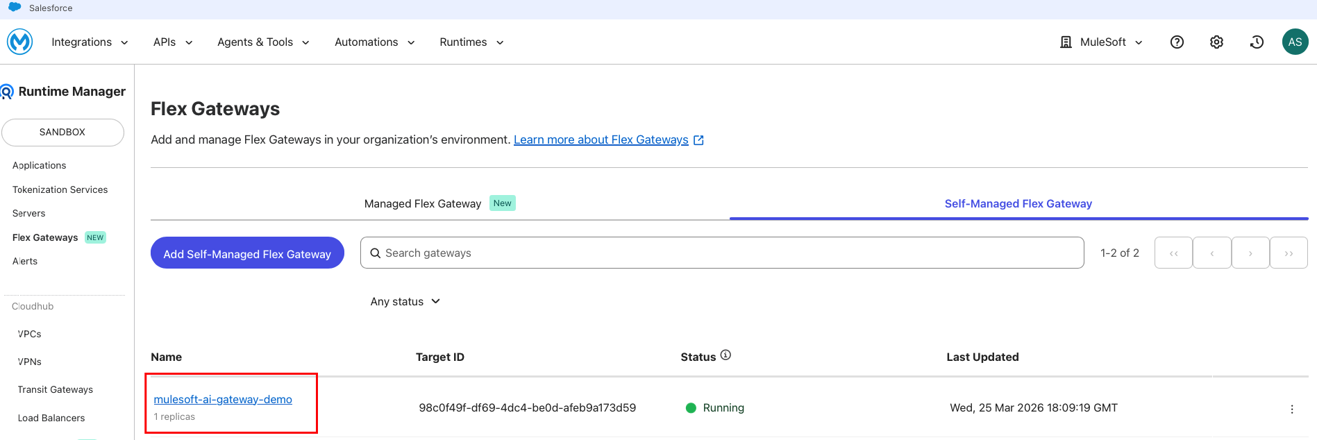Before creating the LLM Proxy, you need a running Flex Gateway instance. If you already have Flex Gateway deployed, skip to Step 2. This tutorial uses Self-Managed Flex Gateway in Connected Mode, which gives you full control over the infrastructure while retaining centralized management through Anypoint Platform.