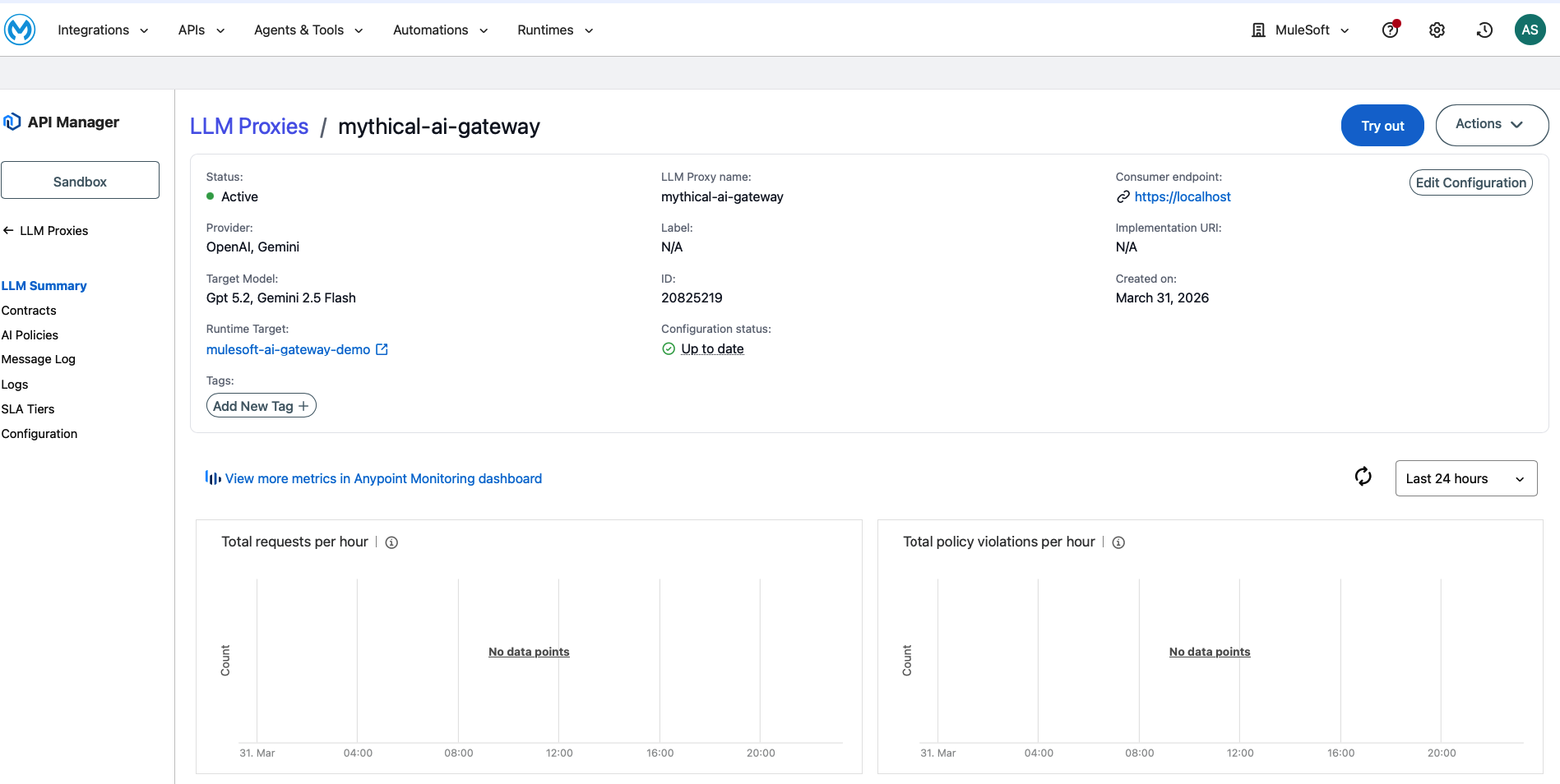 After the wizard completes, your LLM Proxy is deployed and you can access its configuration from API Manager > LLM Proxies > MuleSoft AI Gateway. The left navigation shows: LLM Summary, Contracts, AI Policies, Message Log, Logs, SLA Tiers, and Configuration.