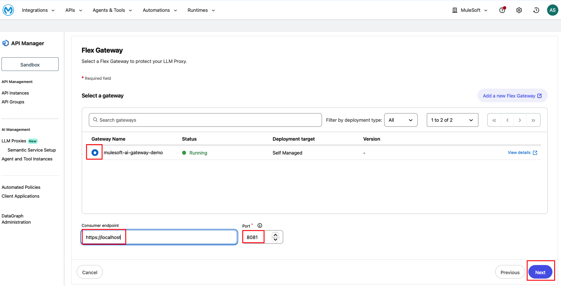 On the Flex Gateway page, select your running gateway from the list: Gateway Name: mulesoft-ai-gateway-demo (Status: Running, Deployment target: Self Managed). Next, set the Consumer endpoint: http://localhost (Since Flex gateway is deployed locally). Then, set the Port: 8081. Click Next.