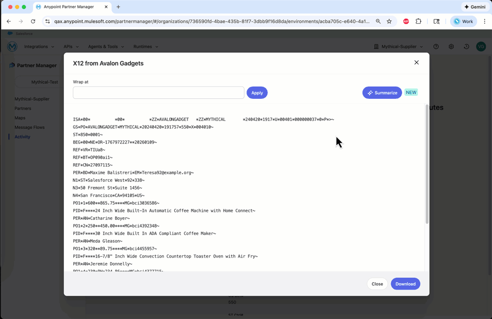 With our latest release, business and IT users can now generate plain-language summaries of both EDI and non-EDI payloads directly from Partner Manager’s payload view, powered by Salesforce Einstein AI. Instead of reading through ISA/GS/ST segments or deeply nested JSON, you get a clear, human-readable summary of what the payload contains: who it’s from, what it represents, and the key data points that matter. Users can also download the summary as a PDF file to share with stakeholders.