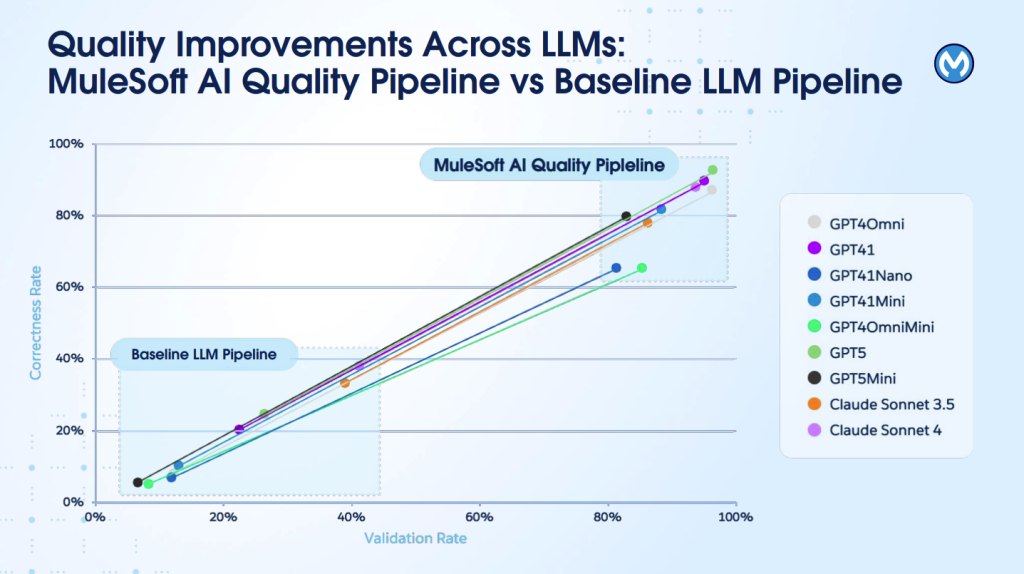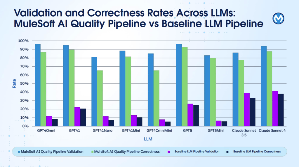 In testing, MuleSoft’s pipeline achieved ~90% validity and ~80% correctness compared to ~20% and ~17% for baseline LLM calls, where a baseline LLM reflects off-the-shelf code generation from direct prompting of models like GPT4, GPT5, Claude Sonnet 4, and so on.